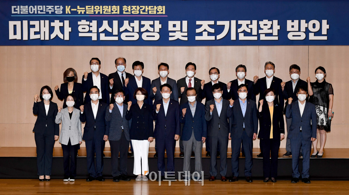 이해찬 더불어민주당 대표와 공영운 현대차 사장 등이 12일 경기 고양시 현대 모터스튜디오 고양에서 열린 ‘더불어민주당 K-뉴딜위원회, 미래차 현장간담회’에서 기념촬영을 하고 있다.