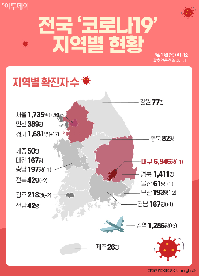 이로써 전국 시·도별 '코로나19' 확진자 수는 △대구 6946명 △서울 1735명으로 가장 많은 비중을 차지했다. 이어 △경기 1681명 △경북 1411명 △검역소 1286명 △인천 389명 △광주 218명 △충남 197명 △부산 193명 △대전 167명 △경남 167명 △충북 82명 △강원 77명 △울산 61명 △세종 50명 △전남 42명 △전북 42명 △제주 26명 순으로 나타났다.