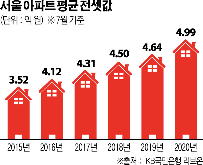 지난달 5억 원 턱 밑까지 쫓아온 서울 아파트 전셋값은 지난달 말 임대차법 통과 이후 급등세가 이어진 것을 고려하면 이달(8월) 5억 원 돌파가 확실시된다.
