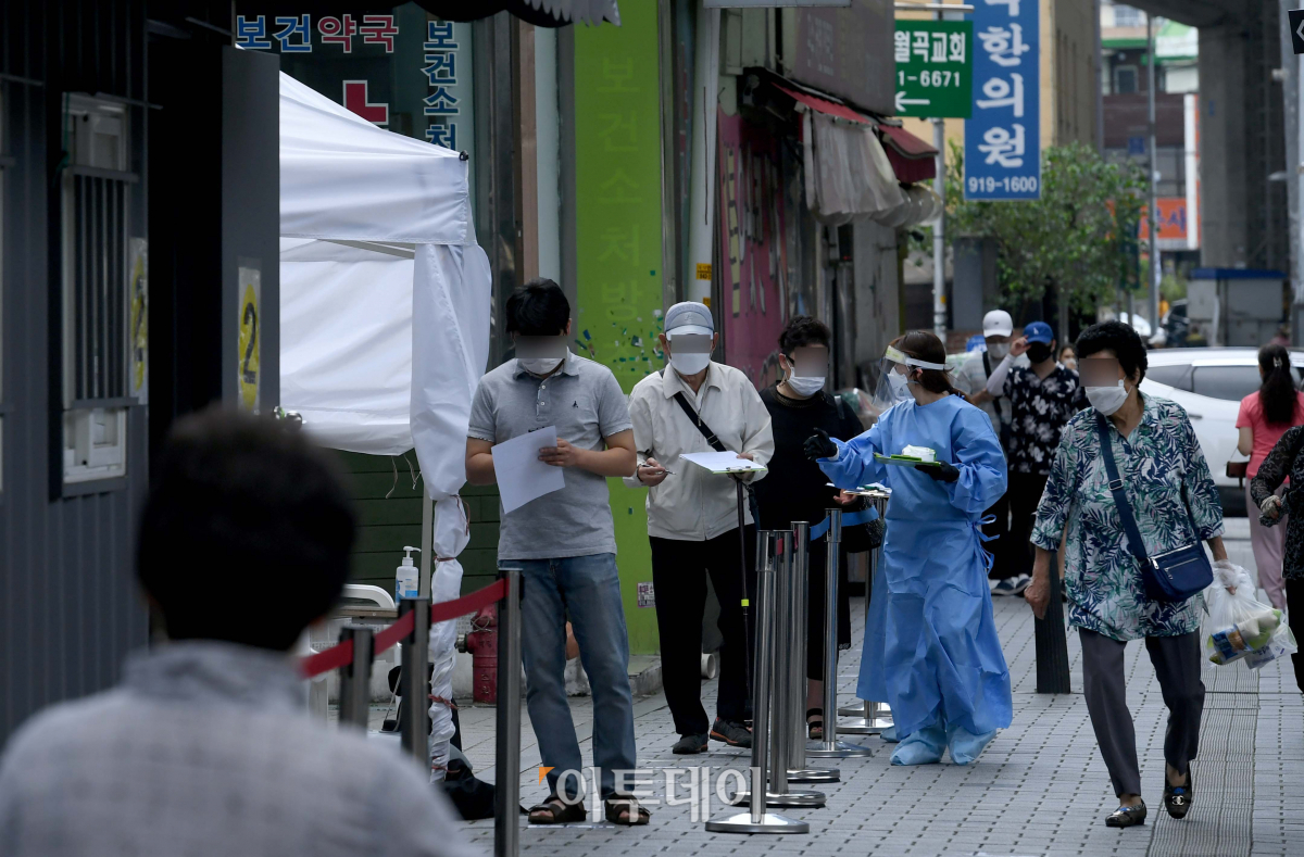 서울과 수도권 지역에서 교회 등을 통해 코로나19가 재확산되는 가운데 17일 서울 성북구보건소에서 시민들이 코로나19 검사를 받기 위해 줄지어 서 있다.