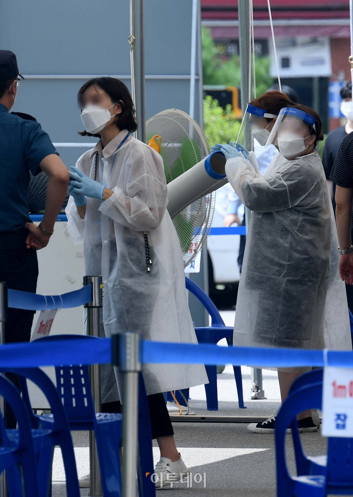 서울과 수도권 지역에서 신종 코로나바이러스 감염증(코로나19)이 재확산되는 가운데 전국 대부분 지역에 폭염특보가 발효된 18일 코로나19 검사자들로 붐비는 서울 영등포구보건소에서 의료진들이 잠시 이동식 에어컨 바람을 쐬고 있다.