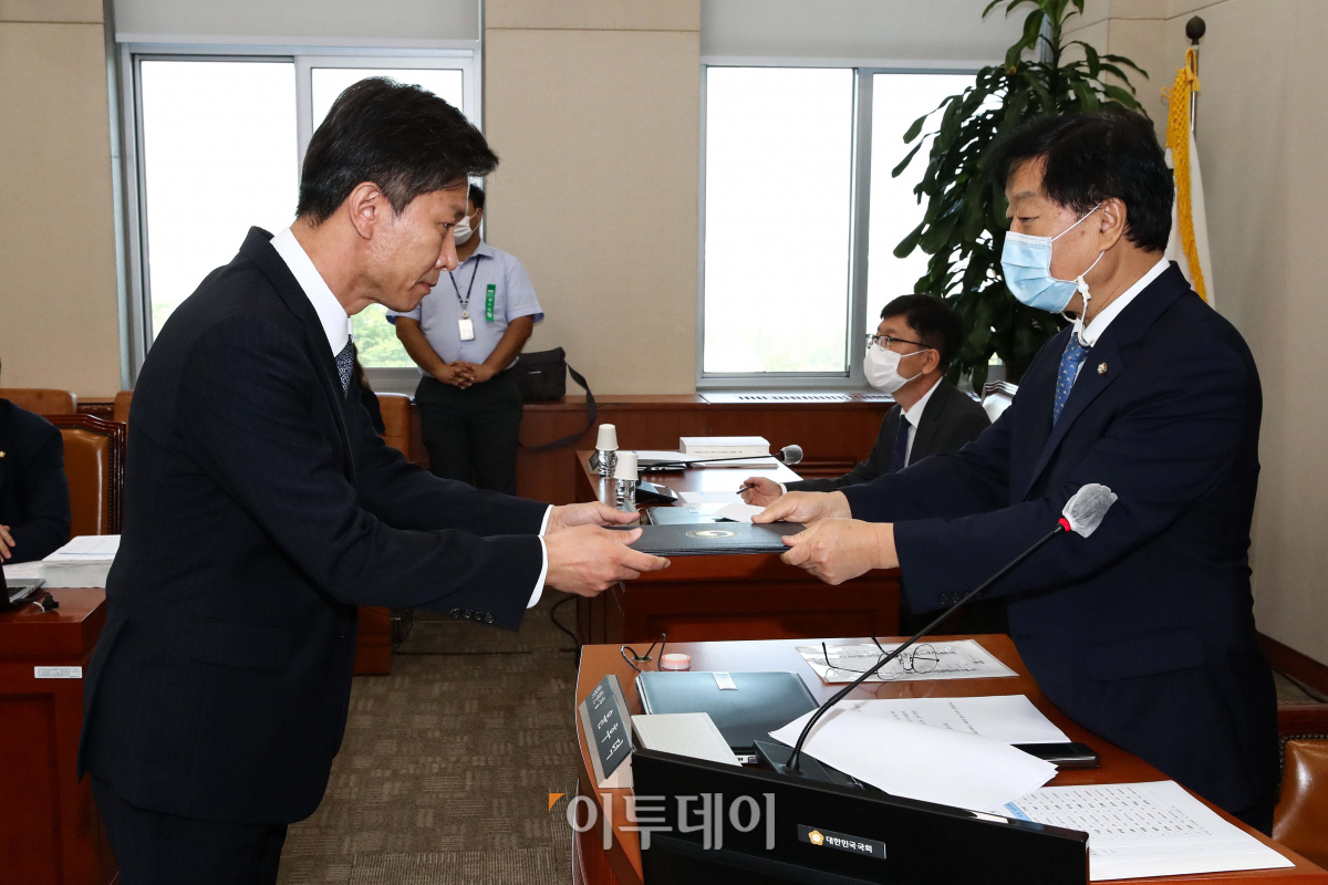 김대지 국세청장 후보자가 19일 서울 여의도 국회에서 열린 인사청문회에서 선서를 마친 뒤 윤후덕 기재위원장에게 선서문을 전달하고 있다.