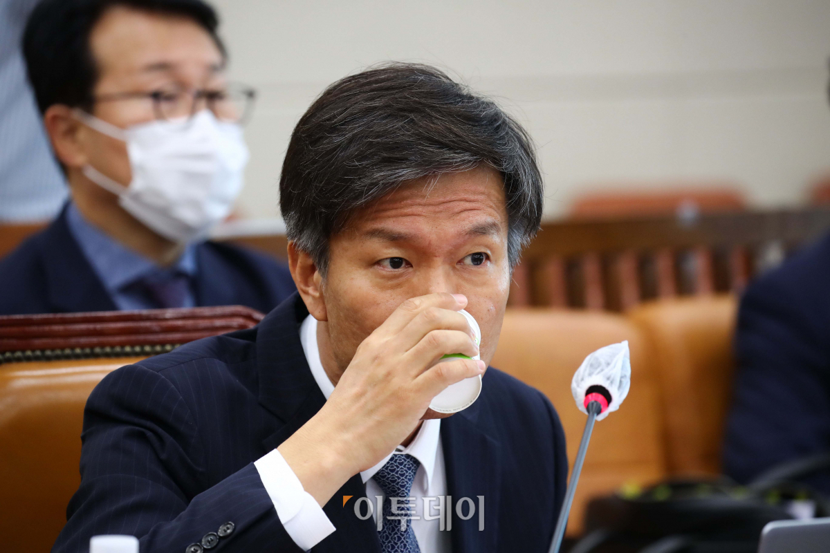 김대지 국세청장 후보자가 19일 서울 여의도 국회에서 열린 인사청문회에서 물을 마시고 있다.