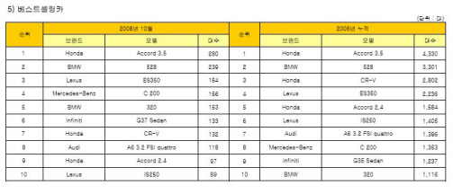베스트셀링 모델은 혼다 Accord 3.5(280대), BMW 528(239대), 렉서스 ES350(164대) 순이었다.