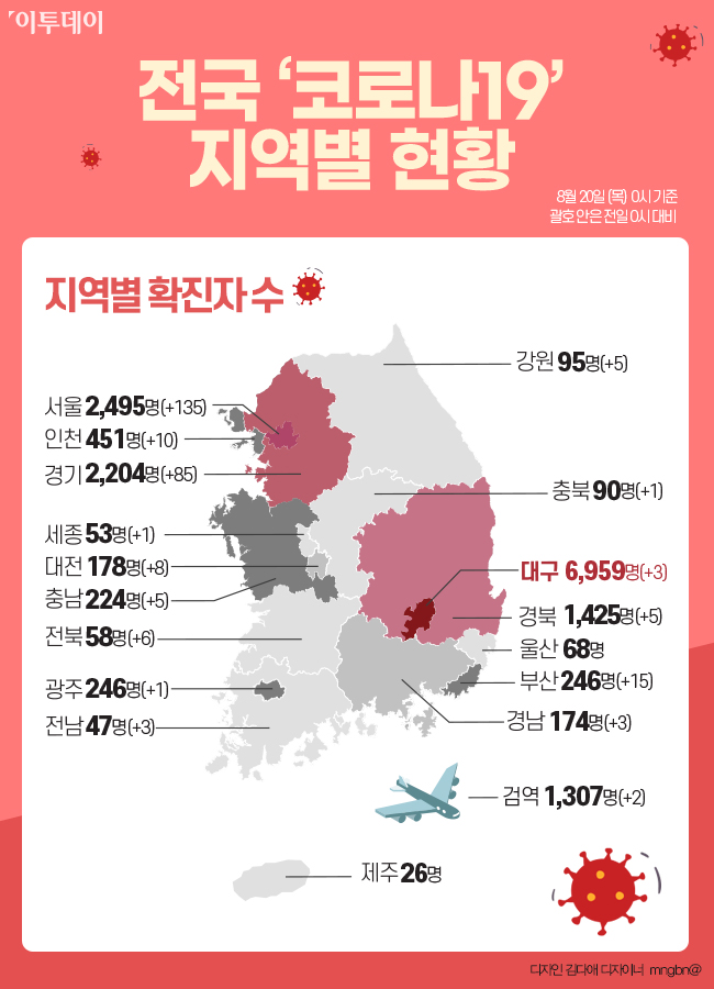 이로써 전국 시·도별 '코로나19' 확진자 수는 △대구 6959명 △서울 2495명으로 가장 많은 비중을 차지했다. 이어 △경기 2204명 △경북 1425명 △검역소 1307명 △인천 451명 △광주 246명 △부산 246명 △충남 224명 △대전 178명 △경남 174명 △강원 95명 △충북 90명 △울산 68명 △전북 58명 △세종 53명 △전남 47명 △제주 26명 순으로 나타났다.