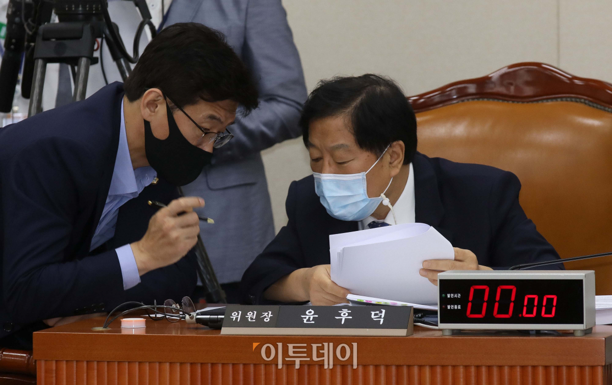 20일 오전 서울 여의도 국회에서 열린 기획재정위원회 전체회의에서 윤후덕 위원장(오른쪽)과 고용진 더불어민주당 간사(왼쪽)가 대화를 나누고 있다.