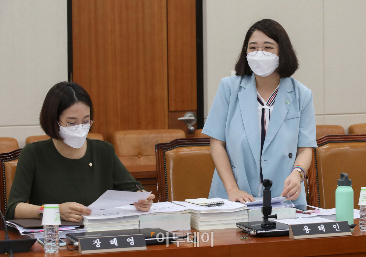 지난 19일 코로나19 확진자가 발생한 TBS라디오에 출현해 김대지 국세청장 후보자 인사청문회 도중 이석한 용혜인 기본소득당 의원이 20일 오전 서울 여의도 국회에서 열린 기획재정위원회 전체회의에서 안부를 묻는 의원들에게 감사를 표하고 있다.