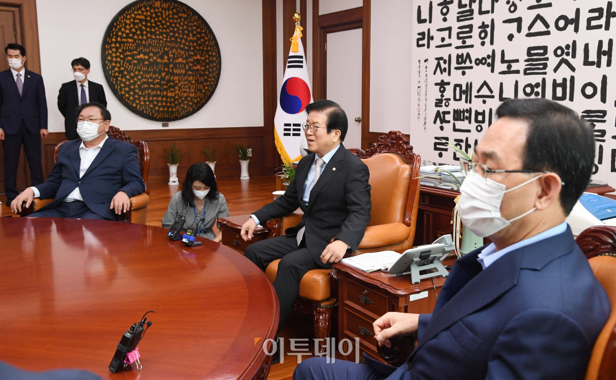 박병석 국회의장과 여야 원내대표가 20일 국회 의장실에서 정례회동을 갖고 있다. 왼쪽부터 김태년 더불어민주당 원내대표, 박 의장, 주호영 미래통합당 원내대표.