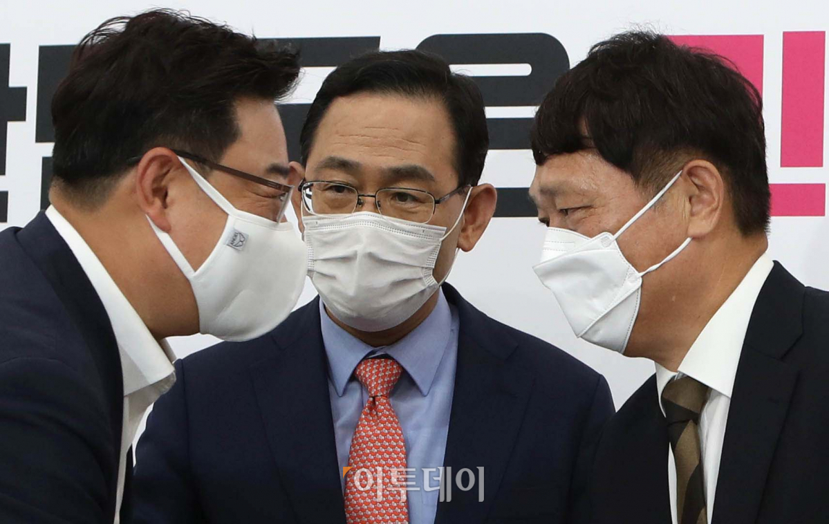 최재성 청와대 정무수석(오른쪽)이 20일 국회에서 미래통합당 김성원 원내수석부대표와 인사하고 있다. 가운데는 주호영 원내대표.