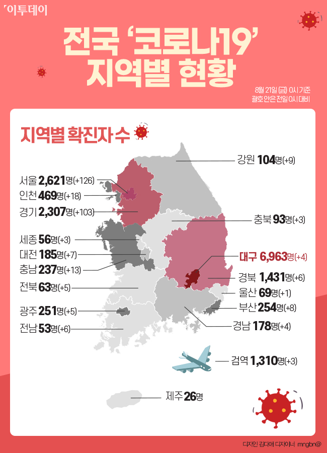 이로써 전국 시·도별 '코로나19' 확진자 수는 △대구 6963명 △서울 2621명으로 가장 많은 비중을 차지했다. 이어 △경기 2307명 △경북 1431명 △검역소 1310명 △인천 469명 △광주 251명 △부산 254명 △충남 237명 △대전 185명 △경남 178명 △강원 104명 △충북 93명 △울산 69명 △전북 63명 △세종 56명 △전남 53명 △제주 26명 순으로 나타났다.