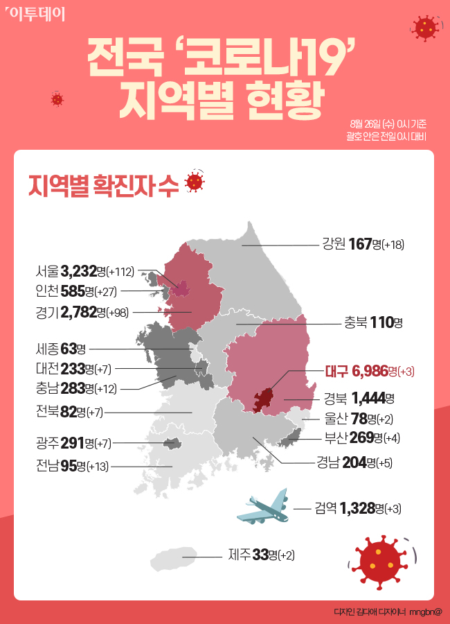 이로써 전국 시·도별 '코로나19' 확진자 수는 △대구 6986명 △서울 3232명으로 가장 많은 비중을 차지했다. 이어 △경기 2782명 △경북 1444명 △검역소 1328명 △인천 585명 △광주 291명 △충남 283명 △부산 269명 △대전 233명 △경남 204명 △강원 167명 △충북 110명 △전남 95명 △전북 82명 △울산 78명 △세종 63명 △제주 33명 순으로 나타났다.