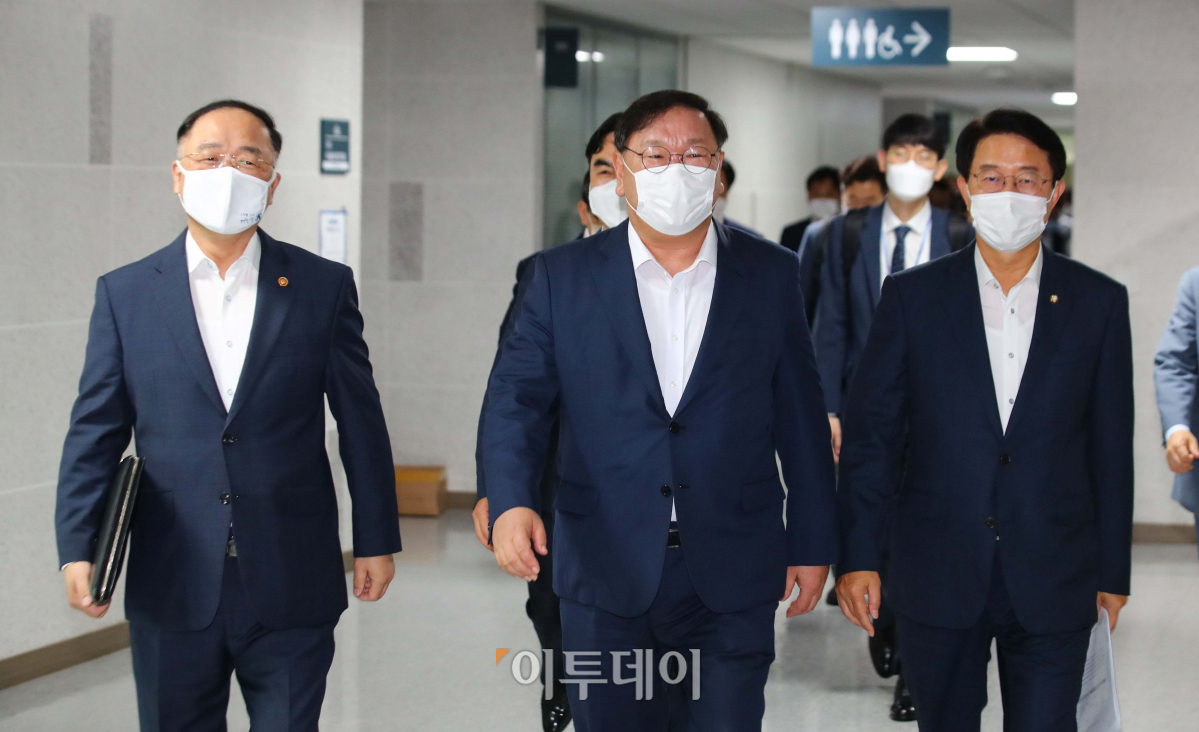 더불어민주당 김태년 원내대표와 홍남기 부총리 겸 기획재정부 장관이 26일 오전 국회 의원회관에서 열린 내년도 예산안 편성 당정협의에 참석하고 있다.
