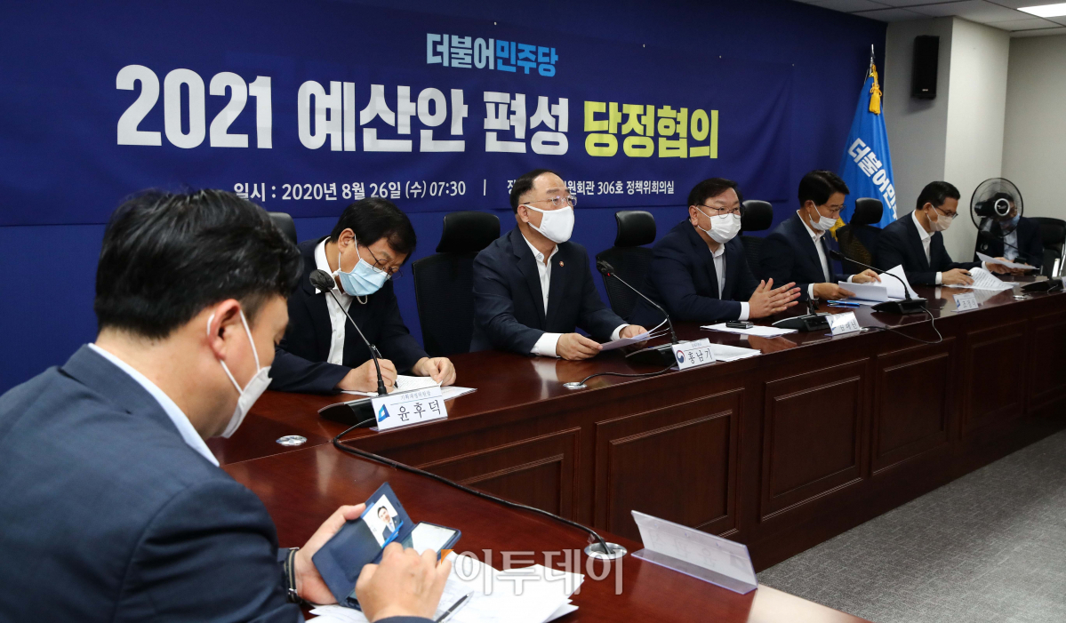 홍남기 부총리 겸 기획재정부 장관이 26일 오전 국회 의원회관에서 열린 2021년 예산안 편성 당정협의에서 모두발언을 하고 있다.