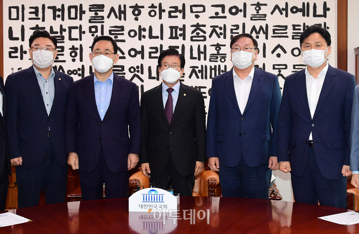 박병석 국회의장과 여야 원내대표가 26일 국회 의장실에서 정례회동을 갖고 기념촬영을 하고 있다. 왼쪽부터 김성원 미래통합당 원내수석부대표, 주호영 원내대표, 박의장,김태년 더불어민주당 원내대표, 김영진 원내수석부대표.