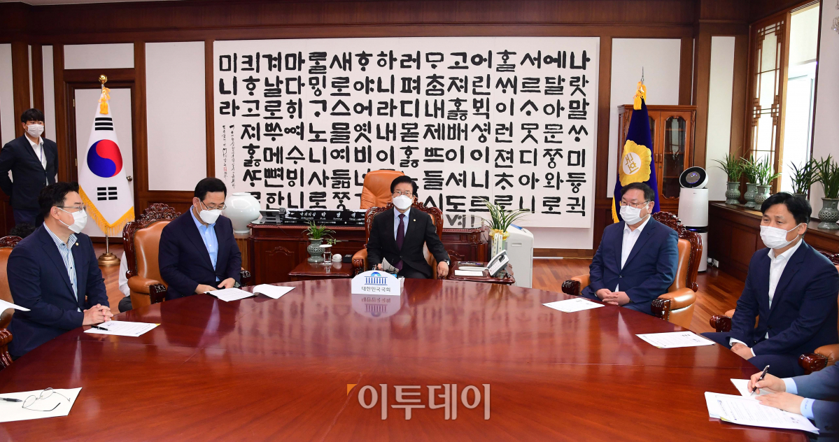박병석 국회의장과 여야 원내대표가 26일 국회 의장실에서 정례회동을 갖고 있다. 왼쪽부터 김성원 미래통합당 원내수석부대표, 주호영 원내대표, 박의장,김태년 더불어민주당 원내대표, 김영진 원내수석부대표.