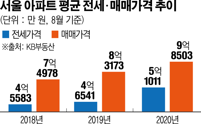 서울 아파트 평균 전셋값이 처음으로 5억 원을 돌파했다. 새 임대차법(계약갱신청구권ㆍ전월세상한제) 시행 전후로 전세가격이 크게 오른 결과로 풀이된다. 서울의 아파트 매매가격도 평균 10억 원에 육박했다.