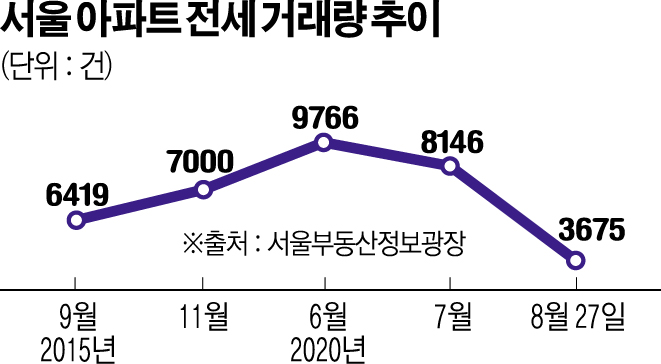 27일 서울부동산정보광장에 따르면 8월 서울 아파트 전세 거래량은 이날 기준 3675건을 기록 중이다. 7월 거래량(8146건)의 절반도 되지 않는 수치다.