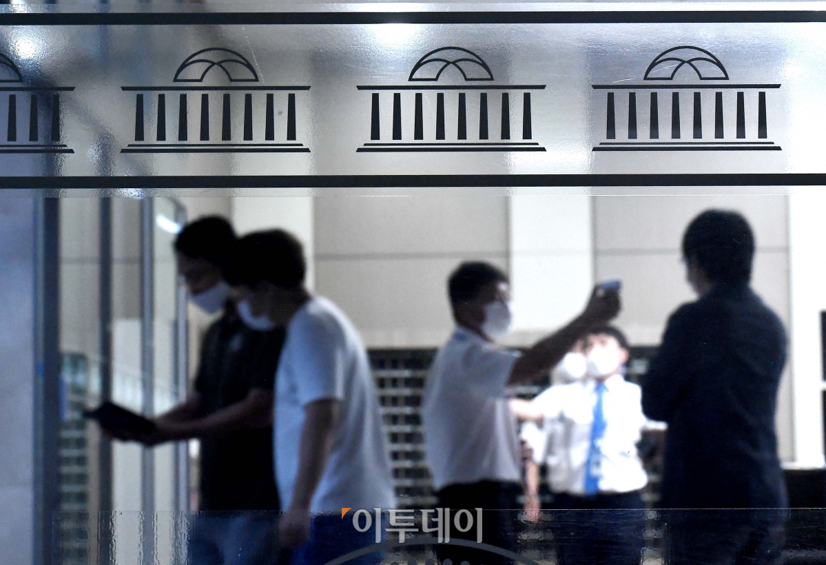 코로나19 확진자 발생으로 폐쇄됐던 국회가 30일 다시 문을 열었다. 국회는 내달 1일 개회식을 열고 약 100일간 정기국회 일정에 돌입하며 민생과 경제 부문에서 코로나19 극복을 위해 발의된 여야 법안들이 상임위원회 등을 거쳐 통과될 전망이다. 이날 서울 여의도 국회에서 관계자가 출입자의 체온을 측정하고 있다.