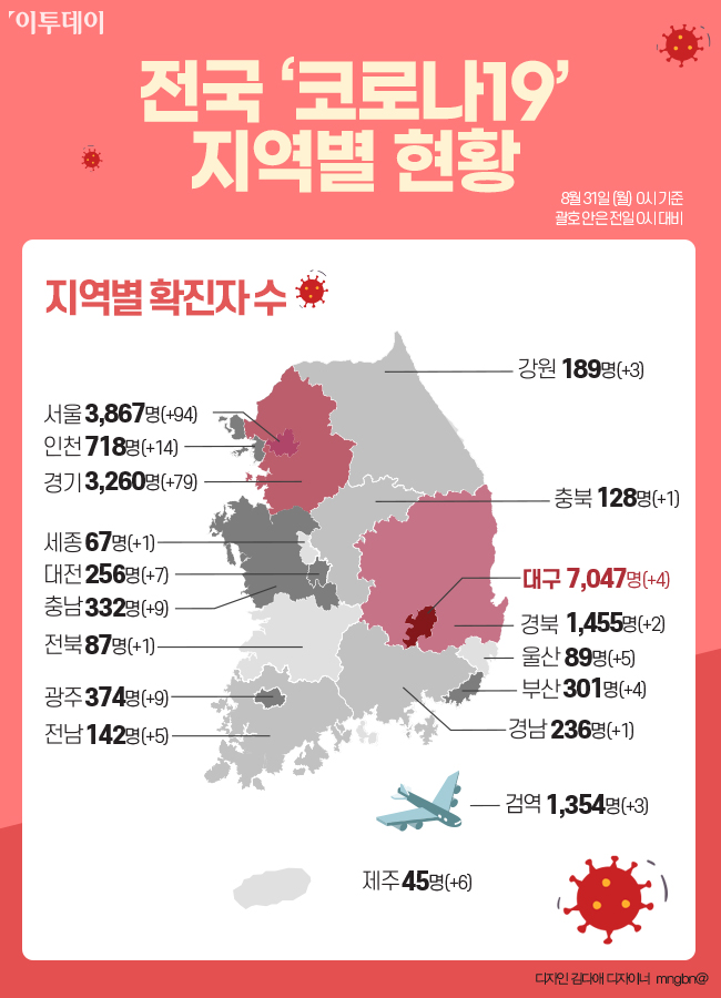 이로써 전국 시·도별 '코로나19' 확진자 수는 △대구 7047명 △서울 3867명으로 가장 많은 비중을 차지했다. 이어 △경기 3260명 △경북 1455명 △검역소 1354명 △인천 718명 △광주 374명 △충남 332명 △부산 301명 △대전 256명 △경남 236명 △강원 189명 △전남 142명 △충북 128명 △울산 89명 △전북 87명 △세종 67명 △제주 45명 순으로 나타났다.