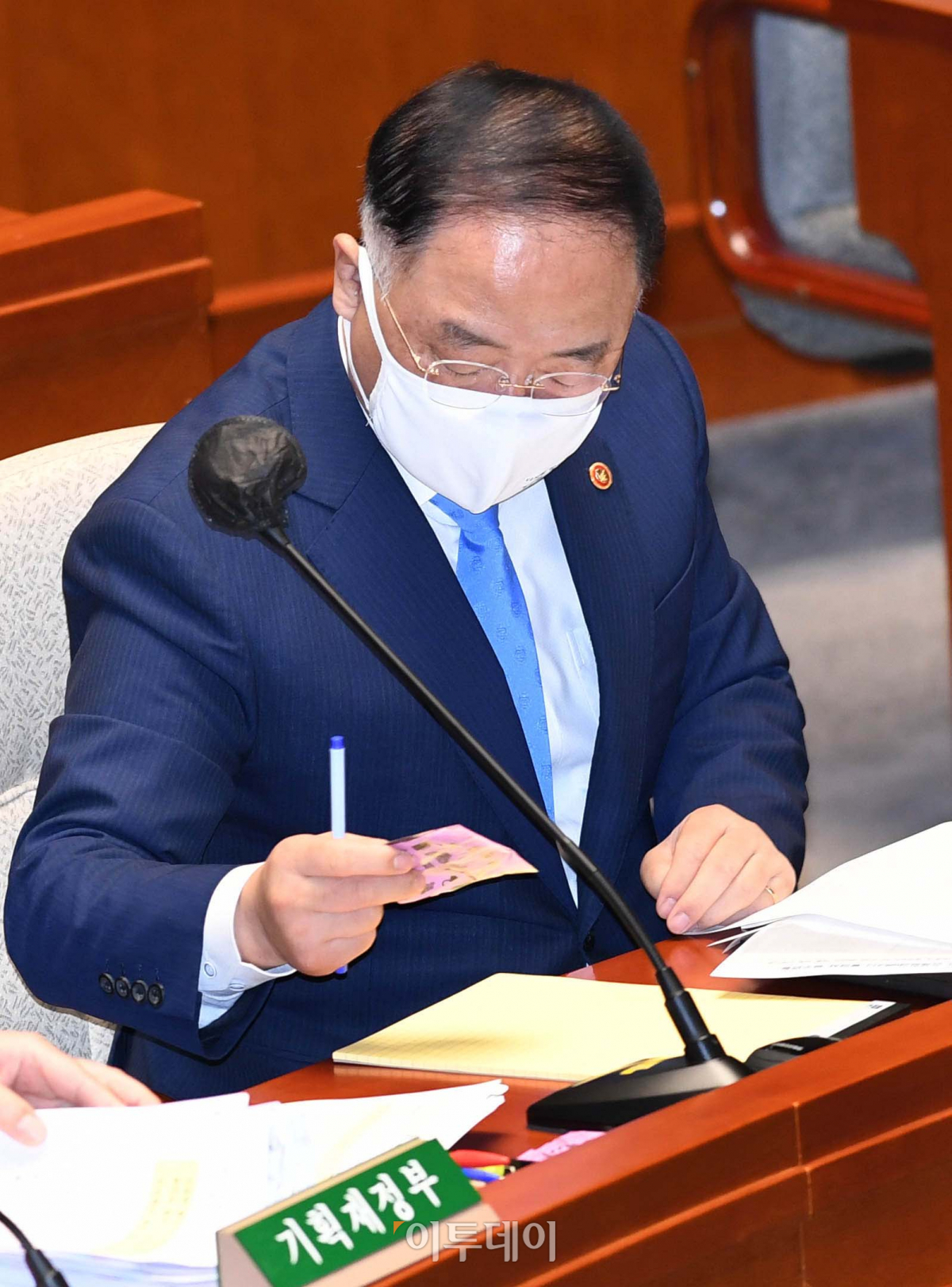 홍남기 부총리 겸 기획재정부 장관이 31일 서울 여의도 국회에서 열린 예산결산특별위원회 부별심사에서 자료를 살펴보고 있다.