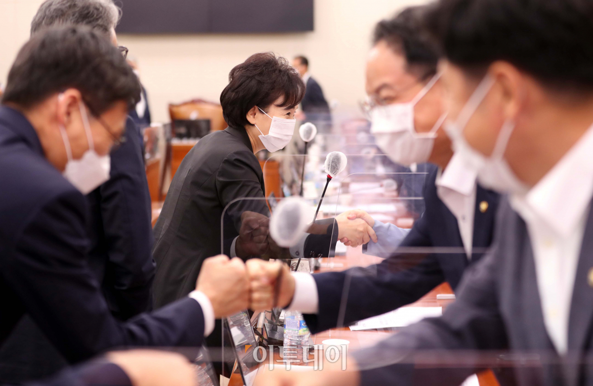 김현미 국토교통부 장관이 31일 서울 여의도 국회에서 열린 국토교통위원회 전체회의에서 의원들과 인사하고 있다.