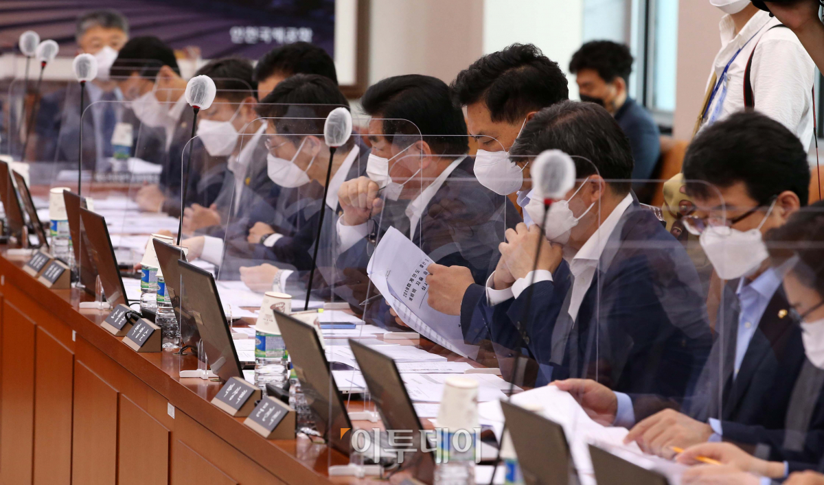31일 서울 여의도 국회에서 열린 국토교통위원회 전체회의 의원석에 칸막이가 설치돼 있다.