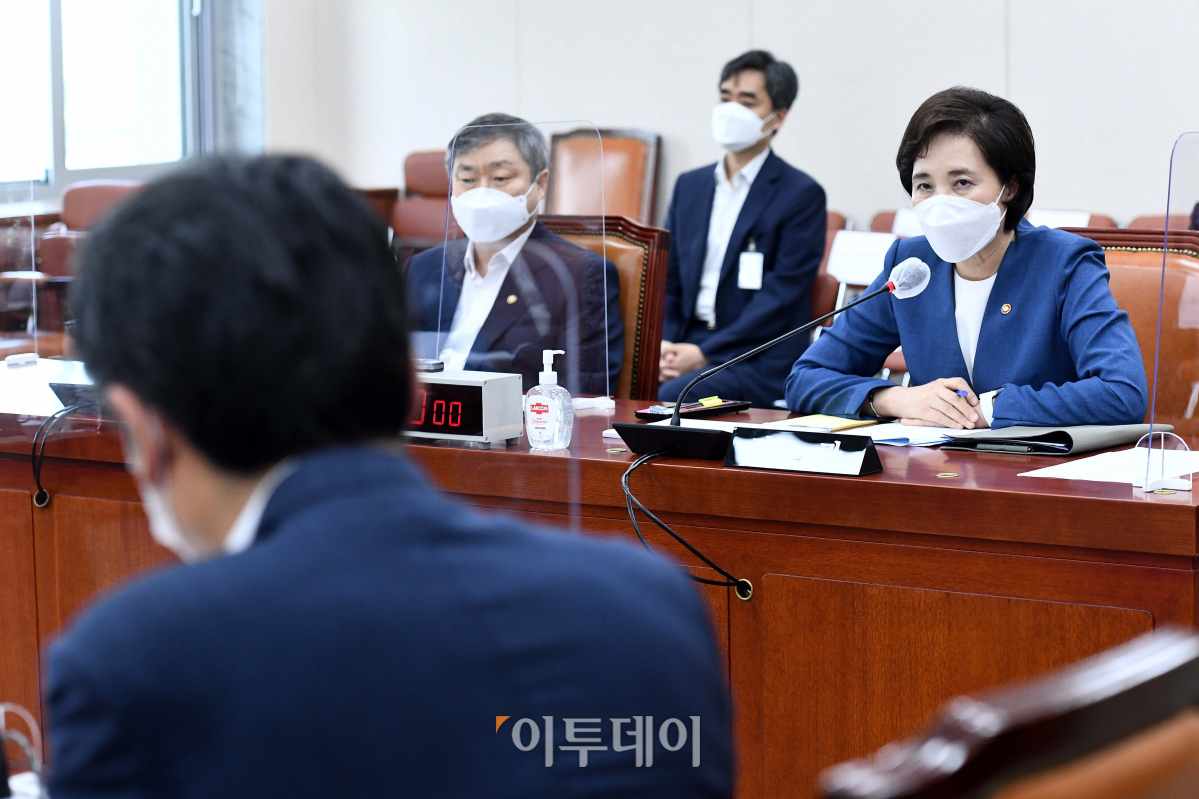 유은혜 부총리 겸 교육부 장관이 31일 서울 여의도 국회에서 열린 교육위원회 전체회의에서 의원의 질의에 답하고 있다.