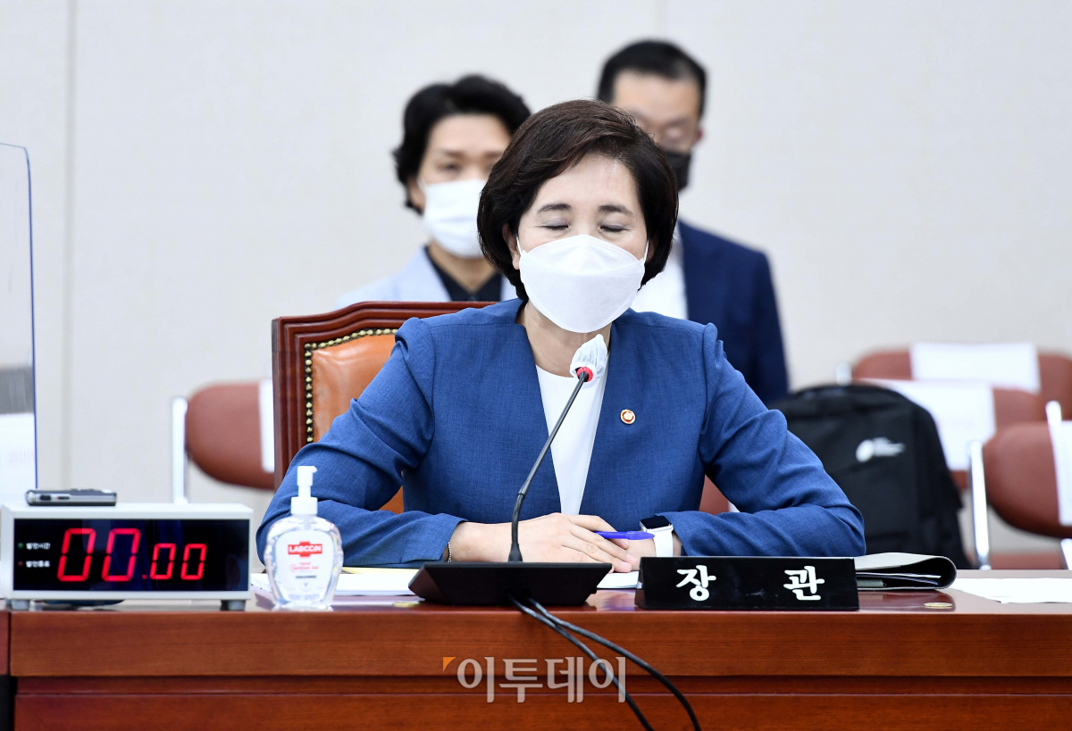 유은혜 부총리 겸 교육부 장관이 31일 서울 여의도 국회에서 열린 교육위원회 전체회의에서 잠시 눈을 감고 있다.