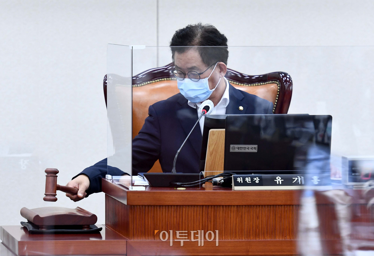 31일 서울 여의도 국회에서 열린 교육위원회 전체회의에서 유기홍 위원장이 의사봉을 두드리고 있다.