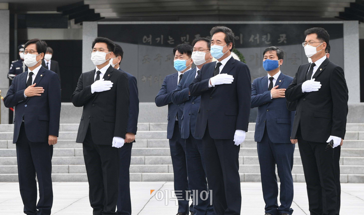 이낙연 신임 더불어민주당 대표를 비롯한 지도부가 31일 서울 동작구 국립서울현충원을 찾아 참배를 마친 뒤 국민의례를 하고 있다.