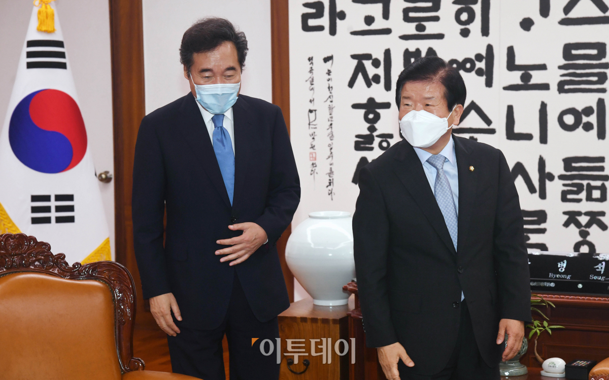 이낙연 신임 더불어민주당 대표가 31일 서울 여의도 국회에서 박병석 국회의장을 예방하고 있다. 신태현 기자 holjjak@