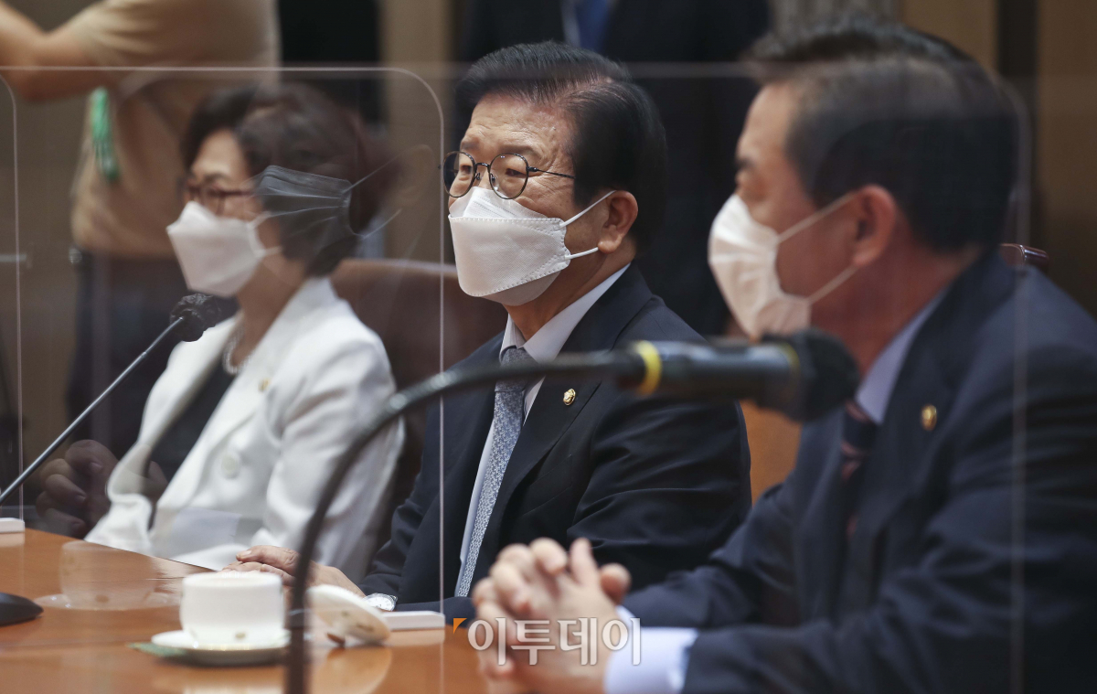 박병석 국회의장(가운데)이 1일 오후 서울 여의도 국회에서 열린 21대 정기국회 개회식 전 사전환담회에서 5부요인과 만나 대화하고 있다.