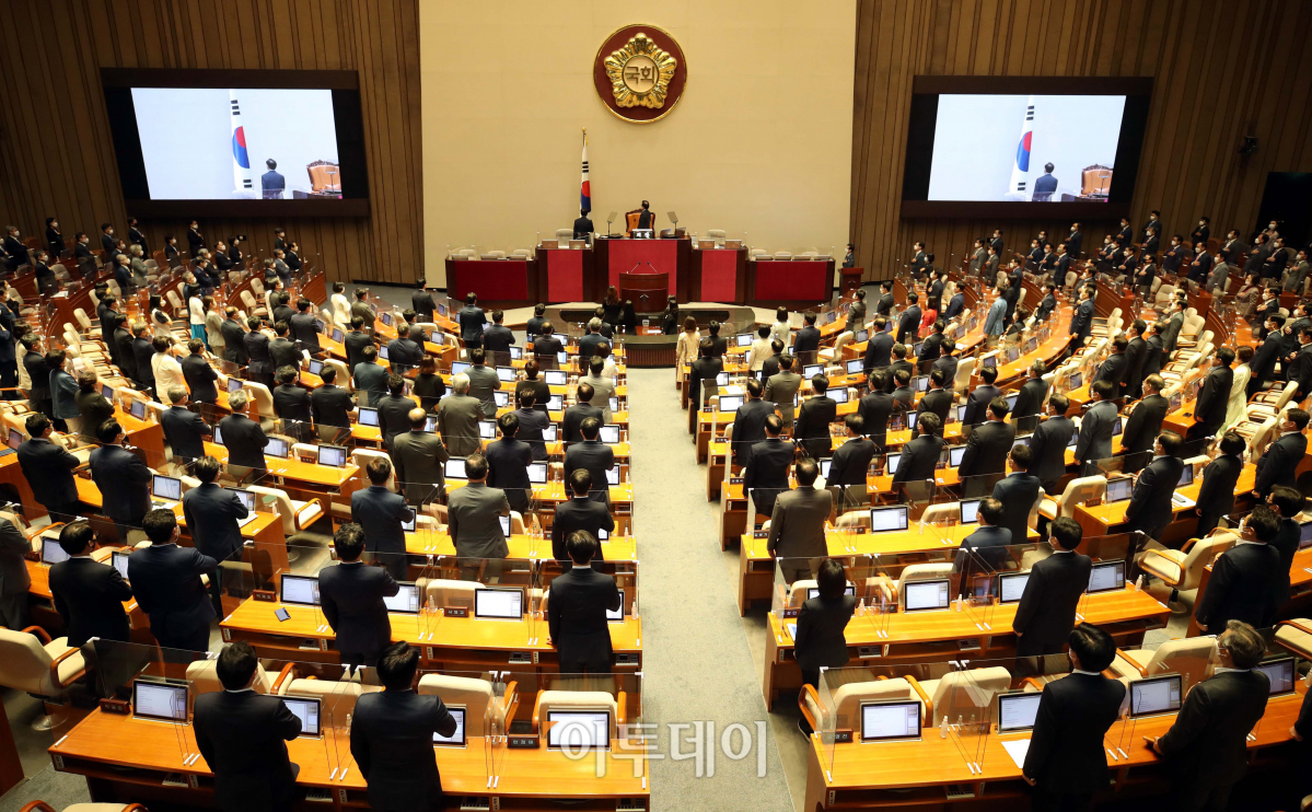 21대 첫 정기국회가 막을 올렸다. 박병석 국회의장과 여야의원들이 1일 오후 국회 본회의장에 열린 정기국회 개원식에서 국민의례를 하고 있다.