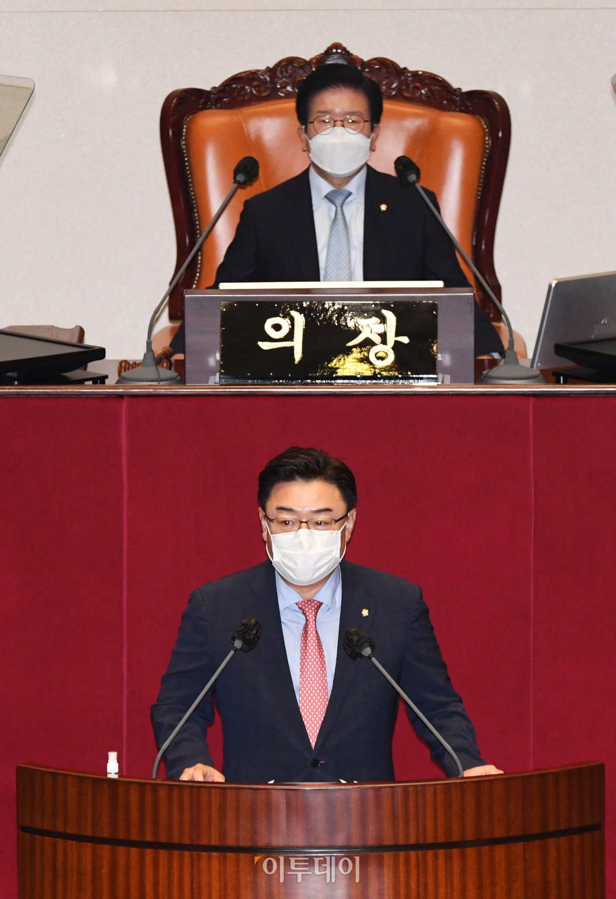 김성원 미래통합당 원내수석부대표가 1일 오후 서울 여의도 국회에서 열린 382회 정기국회 첫 본회의에서 제안설명을 하고 있다.