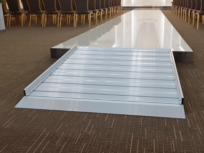 이동식 경사로는 지난해 설치가 법적으로 의무화된 뒤부터 수요가 급증했다. 공연장이나 집회장 및 강당 등에 설치된 무대에 높이 차이가 있는 경우 계단 역할을 하는 이동식 경사로를 반드시 설치해야 한다.