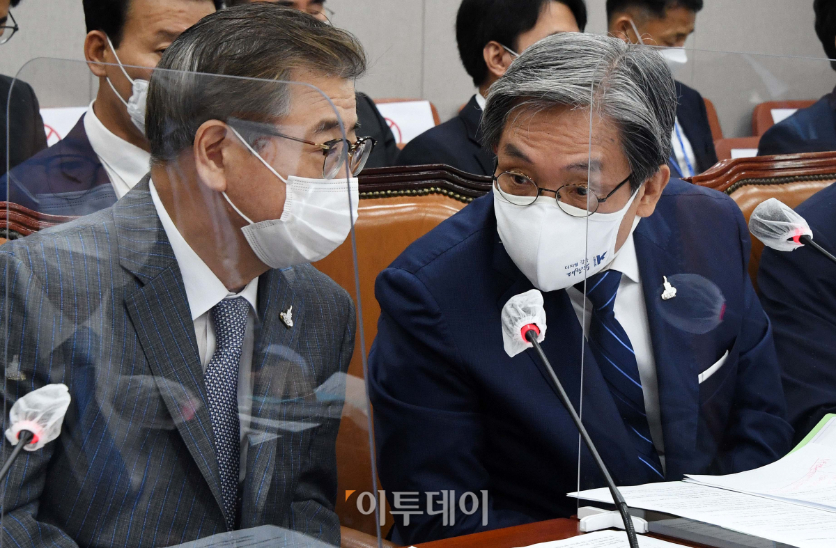 노영민(오른쪽) 대통령비서실장과 서훈 국가안보실장이 2일 국회에서 열린 운영위원회 전체회의에서 논의하고 있다.