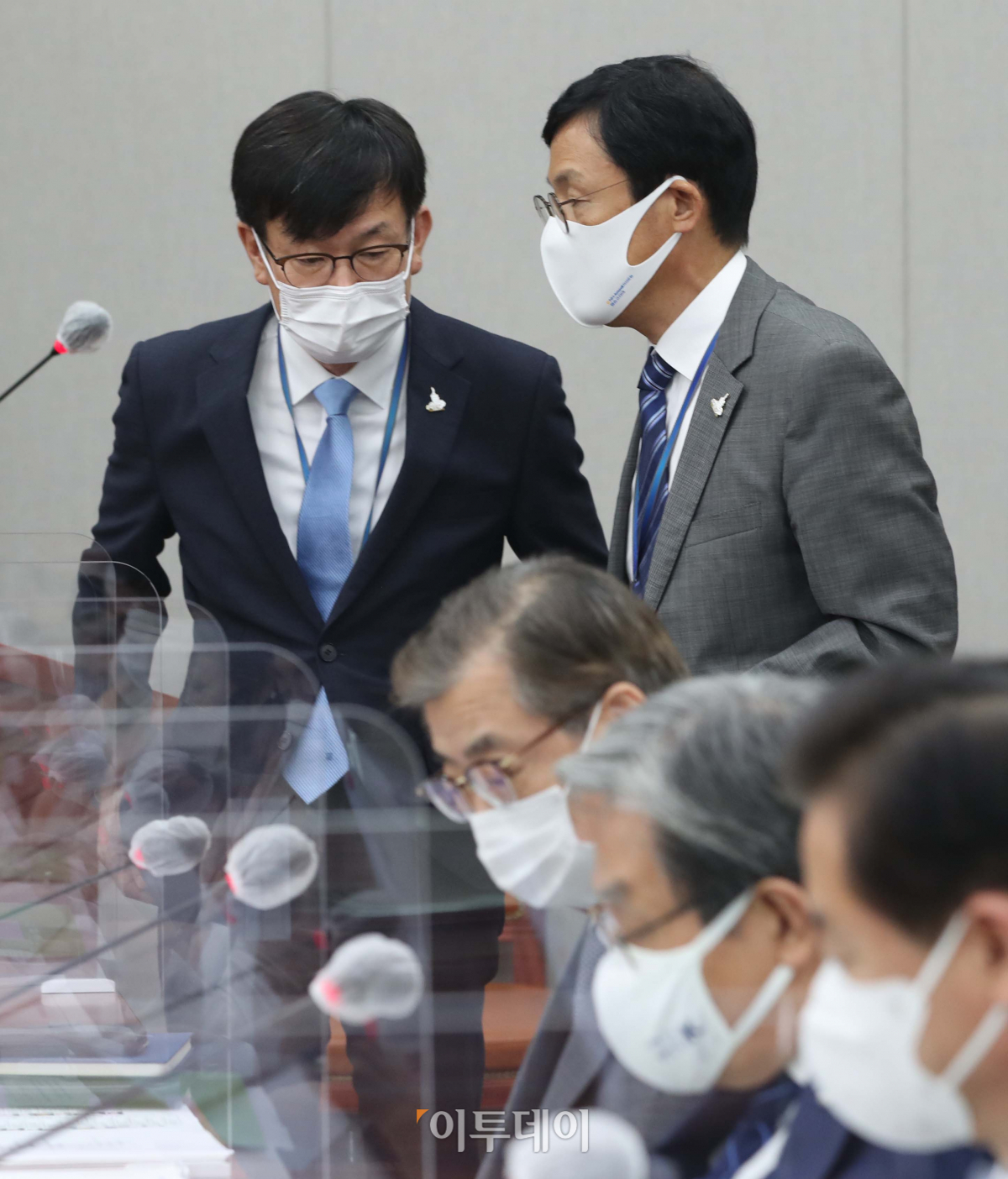 김상조 청와대 정책실장(왼쪽)과 이호승 경제수석이 2일 오후 국회 운영위원회에서 열린 대통령 비서실 등에 대한 결산 심사 및 업무 보고에 앞서 이야기를 하고 있다.