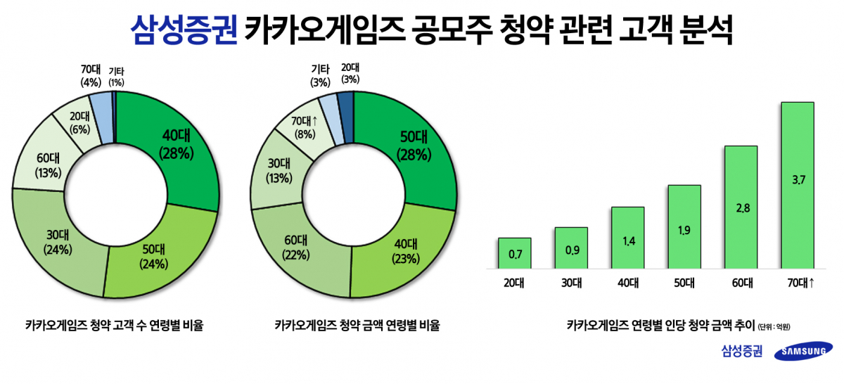 1~2일 진행된 카카오게임즈 청약에 참여한 투자자들 1인당 청약 금액은 70대가 가장 많았다.