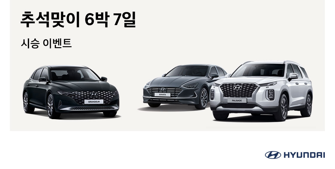 이벤트 당첨 고객을 대상으로 △아반떼 △쏘나타 △쏘나타 HEV △그랜저 △그랜저 HEV △베뉴 △코나 △코나 HEV △코나 EV △싼타페 △팰리세이드 등 250대의 차량을 추석 연휴 기간인 9월 29일부터 10월 5일까지 6박 7일간 무상으로 제공한다.