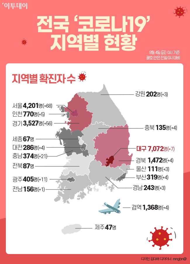 이로써 전국 시·도별 '코로나19' 확진자 수는 △대구 7072명 △서울 4201명으로 가장 많은 비중을 차지했다. 이어 △경기 3527명 △경북 1472명 △검역소 1368명 △인천 770명 △광주 405명 △충남 374명 △부산 319명 △대전 286명 △경남 243명 △강원 202명 △전남 156명 △충북 135명 △울산 111명 △전북 87명 △세종 67명 △제주 47명 순으로 나타났다.