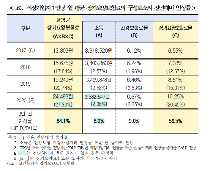 장기보험료율의 경우 2017년 6.55%에서 올해 10.25%로 인상되면서 최근 3년간 인상률이 56.5%에 달한다. 보험료로 따지면 직장가입자는 2017년 월평균 1만3303원에서 올해 2만4493원(추정치)을 내야 한다. 최근 3년간 인상률은 84.1% 수준이다.