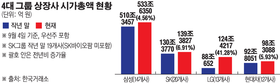 올 초까지 LG그룹은 국내 4대 그룹 중 상장사 시총 규모에서 현대차그룹에 뒤처진 ‘꼴찌’였다. 그러나 코로나19 유행으로 LG그룹 소속 상장사들의 미래 성장성이 재평가되며 몸집이 급격히 불어나기 시작했다. 현재 LG그룹은 현대차그룹(12개사·98조3088억 원)과의 격차를 20조 원 넘게 벌리며 상장사 시총 규모 3위로 올라선 상태다. 게다가 2위인 SK그룹(20개사·139조3827억 원)과의 격차도 작년 말 기준 42조 원 수준에서 15조 원 아래로 줄어들었다. SK그룹이 시총 15조 원에 육박하는 SK바이오팜을 지난 6월 상장하지 않았다면 당장 추월도 가능했을 수준이다.
