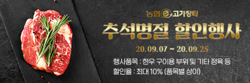 그간 저렴한 가격으로 축산물을 공급해왔던 농협e고기장터는 코로나로 힘든 사업주들에게 더욱 힘이 되고자 추석명절 할인행사를 진행한다. 이번 추석 명절 할인행사는 9월 7일부터 9월 25일까지 진행하며, 한우 구이용 부위 및 기타 정육을 3~7% 추가 할인하며, 일부 품목은 10%까지 할인한다.