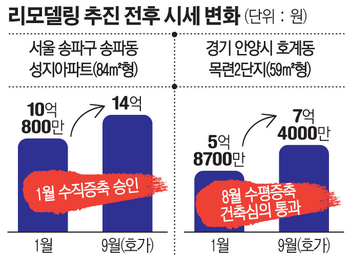 수평증축을 추진하는 경기 안양시 호계동 목련 2단지도 리모델링 호재를 누리긴 마찬가지다. 이 아파트는 지난달 건축심의를 통과했는데 전용 59㎡형 기준으로 시세가 7억 원을 웃돌고 있다. 5억 원대에도 아파트를 구할 수 있었던 연초와 비교하면 1억 원 넘게 집값이 올랐다. 주변 부동산에선 현재 시세와 증축으로 늘어나는 가구당 면적을 감안하면 리모델링 후엔 수억 원대 수익을 챙길 수도 있으로 것으로 예상한다.