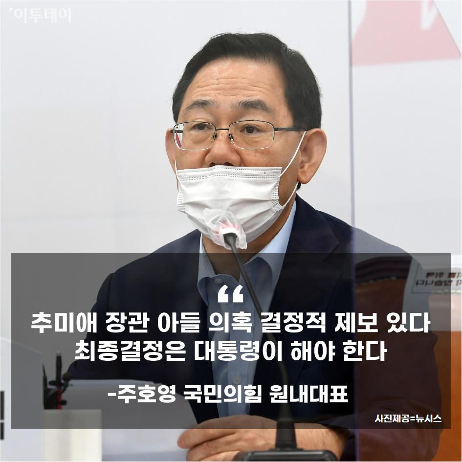 국민의힘 주호영 원내대표가 추미애 법무부 장관 아들 서모 씨의 군 복무 특혜 의혹을 입증할 '결정적 제보'가 있다면서 문재인 대통령의 결단을 촉구했습니다. 주호영 원내대표는 10일 방송된 CBS라디오 '김현정의 뉴스쇼'에서 '대통령이 결단하라고 할 만큼 더 결정적인 추가 제보가 또 있느냐'는 진행자의 질문에 "있다"고 답했습니다. 이어 추미애 장관이 자진해서 사퇴할 가능성이 없다면서 "최종 결정은 대통령이 해야 한다"고 말했습니다.