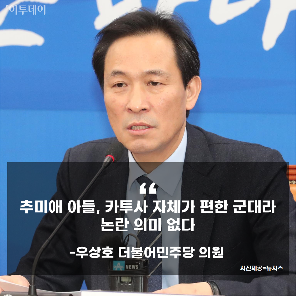 우상호 더불어민주당 의원이 추미애 법무부 장관의 아들 관련 논란에 대해 “카투사 자체가 편한 군대라 논란은 아무런 의미가 없다”고 주장했습니다. 우상호 의원은 9일 연합뉴스를 통해 “카투사는 육군처럼 훈련하지 않는다. 그 자체가 편한 보직이라 어디에 있든 다 똑같다”라며 이같이 말했습니다. 그러면서 “카투사에서 휴가를 갔느냐 안 갔느냐, 보직을 이동하느냐, 안 하느냐는 아무 의미가 없는 얘기”라고 덧붙였습니다.