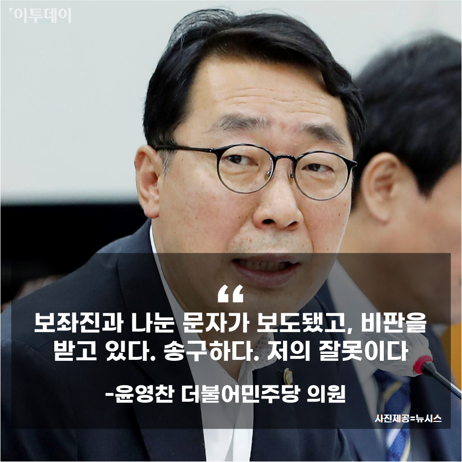 더불어민주당 윤영찬 의원이 이른바 '카카오 문자' 논란과 관련해 "질책을 달게 받겠다"며 사과했습니다. 윤영찬 의원은 9일 자신의 페이스북을 통해 "보좌진과 나눈 문자가 보도됐고, 비판을 받고 있다"며 "송구하다. 저의 잘못이다"라고 말했습니다. 이어 "여야 대표연설의 포털 노출 과정의 형평성에 의문을 가졌던 것으로, 묻고자 했던 것은 뉴스 편집 알고리즘의 객관성과 공정성이었다"면서 "비록 보좌진과 대화라 해도 엄밀한 자세와 적절한 언어를 사용하지 못했다. 이번 일을 커다란 교훈으로 삼아 한마디 말과 한 걸음 행동의 무게를 새기겠다"고 덧붙였습니다.