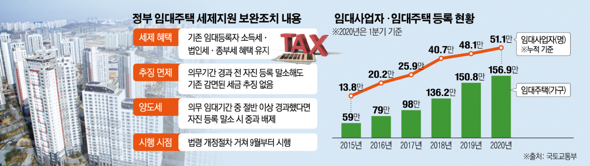 정부는 지난달 '민간임대주택특별법 개정에 따른 임대주택 세제 지원 보완조치'를 발표하며 기존 민간 임대사업자에 대해 임대 의무기간의 절반만 채우면 임대주택에 대한 양도세 중과를 하지 않고 거주주택에 대한 양도세도 비과세하기로 했다.