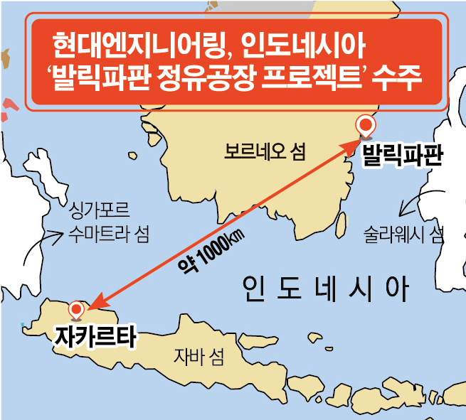 현대엔지니어링이 인도네시아 '발릭파판 정유공장 프로젝트'에서 에서 1억7000만 달러(약 2017억 원) 규모의 추가 공사를 수주했다. 이로써 이 회사는 인도네시아 발릭파판에서만 총 3건의 수주 실적을 올렸다.
