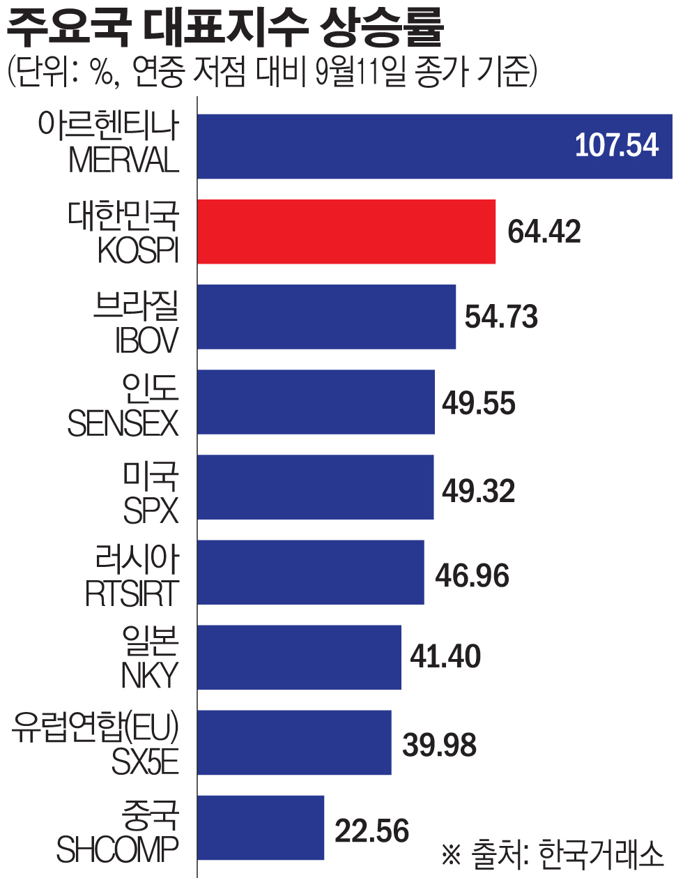 13일 한국거래소에 따르면 지난 11일 종가 기준 G20 국가의 대표 증시 지수를 연중 저점과 비교했을 때 코스피 지수는 64.42% 상승해 아르헨티나(107.54%)에 이어 두 번째로 높은 상승률을 보였다.